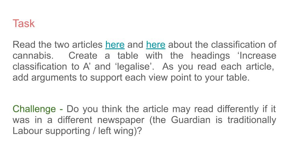 Cannabis and Nitrous Oxide PSHE (drugs) lesson resource on drugs which recaps probable prior learning and vocabulary before considering the classification of cannabis debate and the possible consequences of nitrous oxide use, it also encourages pupils to consider the source and possible bias of the evidence they are using. Pictures show an example of slides included in the lesson.