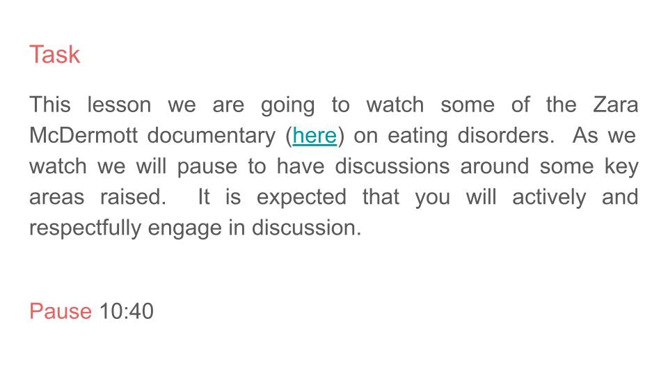 Eating Disorders PSHE lesson resource looking at eating disorders and the impact of social media on the increase in people seeking support since the pandemic. The lesson uses Zara McDermott’s (from Love Island) recent documentary alongside considered discussion prompts (these could also be turned to written questions). The documentary can be found on iplayer. Pictures show samples of the slides included in the lesson.