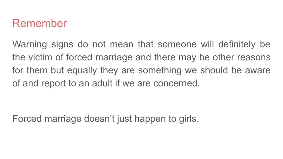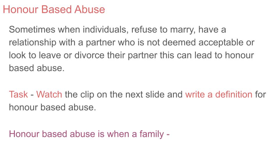 PSHE Lesson resource on the issues of forced marriage and honour based abuse. The lesson considers what a marriage is and the difference between arranged and forced marriage before looking at the warning signs and consequences of forced marriage and honour based abuse. The lesson then goes on to inform pupils of what they should do if they are concerned about these issues and provides a scenario task for pupils to demonstrate their learning. This lesson is also available in a shorter form time resource.