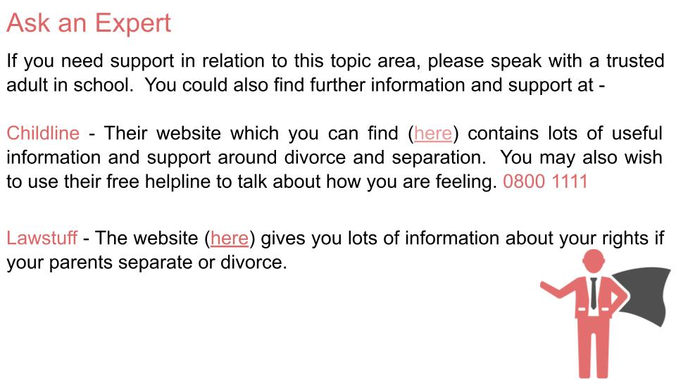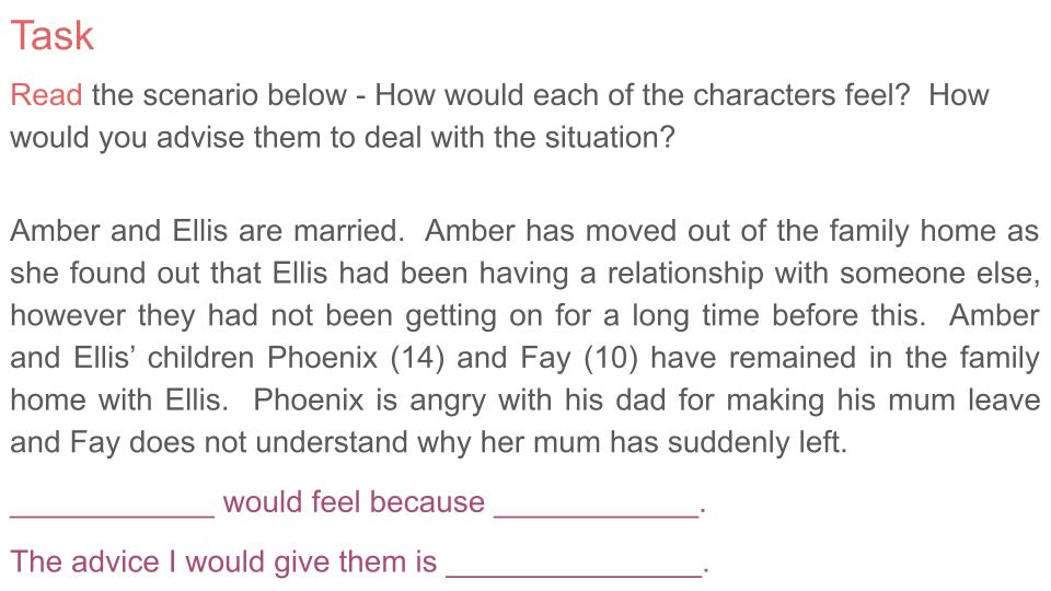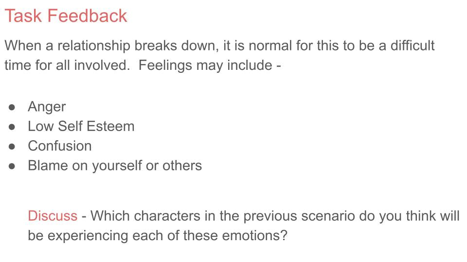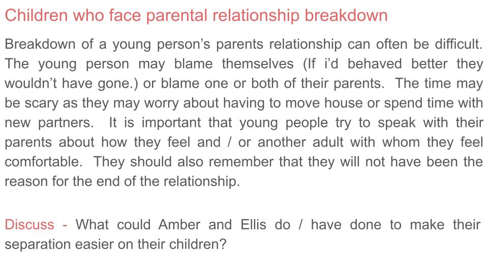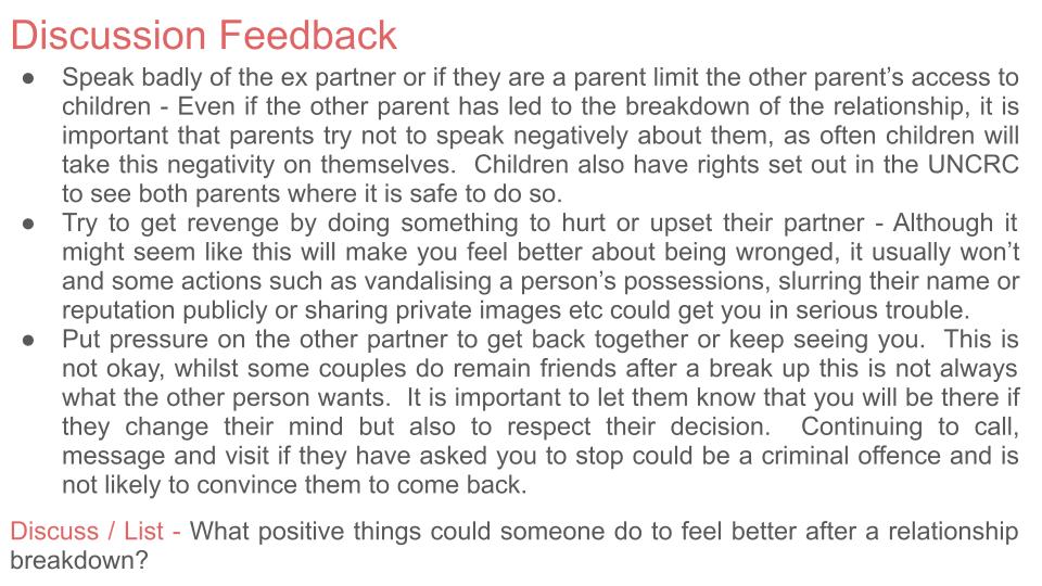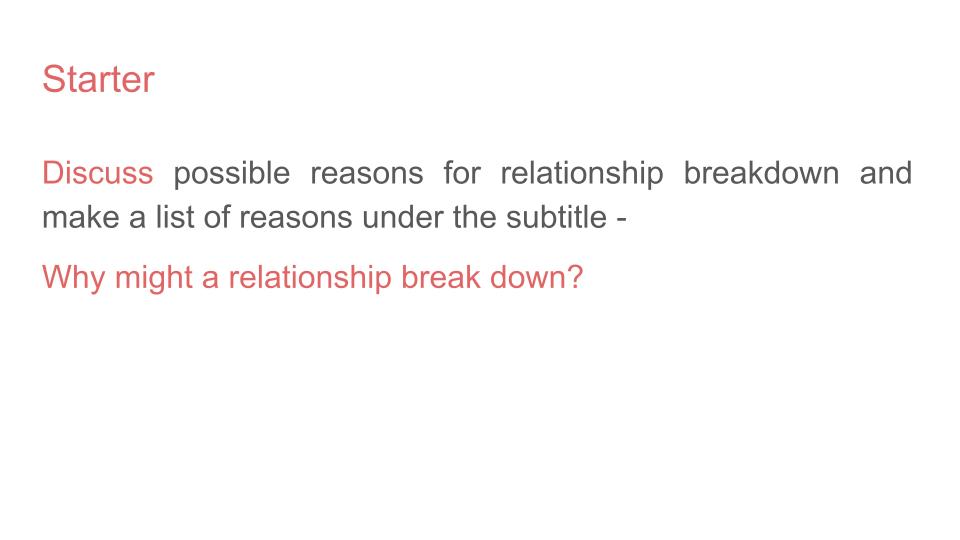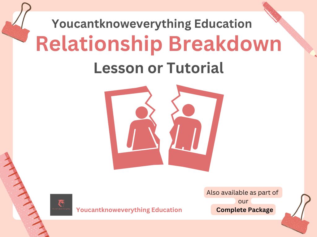 Relationship breakdown PSHE lesson resource. This relationships lesson covers the reasons why relationships might break down and how this can be dealt with amicably and with respect. Pupils are encouraged to consider some of the unhealthy and unkind things people may do at the end of a relationship and look for ideas of better ways to deal with the difficult feelings which may be present. The lesson also considers the impact of relationship breakdown of adults on children.